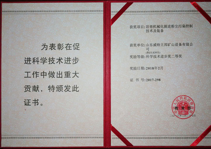 • 巖巷機械化掘進粉塵污染控制技術及裝備科學技術進步獎